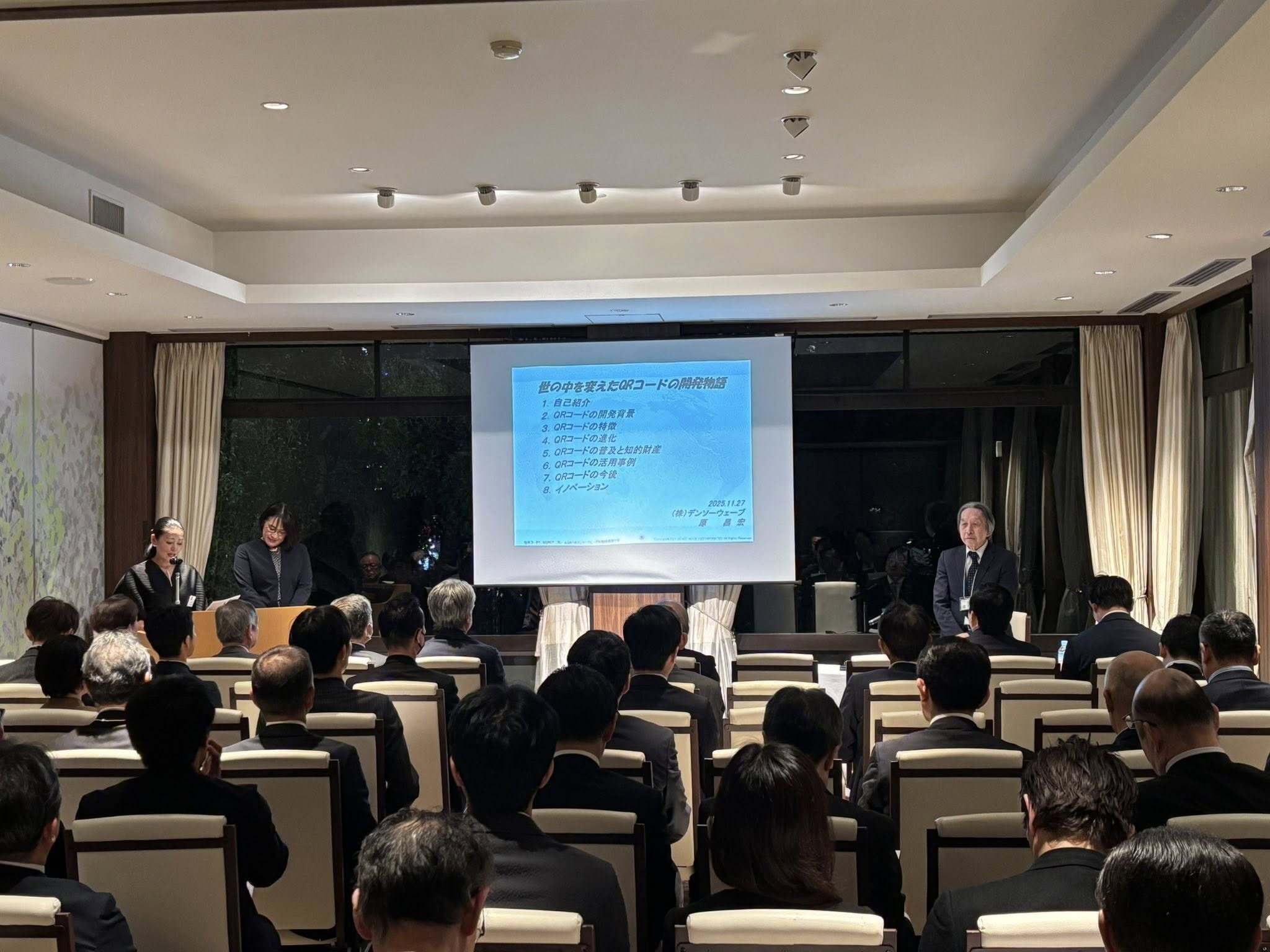 第一部では会場もほぼ満席の中、「世の中を変えたQRコードの開発物語」と題しまして、株式会社デンソーウェーブ主席技師 原昌宏様(法政大学名誉博士)よりQRコードの開発秘話をお話しいただきました。現代社会にこんなにも広く普及し活用されている技術を、無償で公開されているのですが、公開当初はこんなに浸透するとは誰も予想していなく、会社でも無償公開する決裁はすんなり通ったのだとか。その他普段なかなか聞けないお話しをたくさん聞かせていただきました。