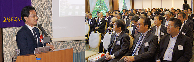 続いてご来賓を代表し、白石典義立教大学統括副総長より、本日の講演は3月26日に行った経済人クラブの幹部の皆さまとの懇談会からスタートしたこと、大学組織としてこれまで以上に経済人クラブとの関係を強固にしていきたい。そこから、校友との連携を強化して、アドバイスを頂きながら「スーパーグローバル大学構想」を具現化して行きたいとご挨拶されました。 続いて、神谷昭男立教学院理事長より、「スーパーグローバル大学構想」をはじめ、私たちが在学していたころと比べて大学は大きく変わってきている。学院としても応援していきたい。景気が上向き傾向であり、この波に乗って様々な課題を乗り越えて生きたいとご挨拶を頂きました。