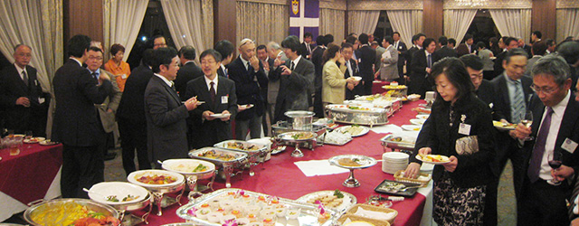 立教大学校友会会長 田尾兵二様より乾杯の音頭がとられ、宴会が始まりました。歓談の時間には、新入会員をはじめ、幅広い世代の校友が名刺交換を通して人脈を広げ、久しぶりに会う同級生、先輩後輩が最近の動向や学生時代の懐かしい話に加えて、松本楼の美味しい食事とお酒により会場は終始盛り上がっていました。