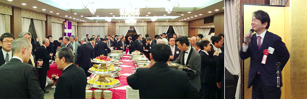 第二部は、会場を移し「新春名刺交換会」を19時より開宴しました。当日は、100名以上の会員に加え、立教学院理事長 糸魚川順様、立教大学総長 吉岡知哉様、経済学部長 池上岳彦様をはじめ、経済学部、法学部から教授の方々、学院関係職員の方々、校友会副会長 小出康之様、マスコミ立教会など15 名のご来賓をお招きして盛大に開催されました。