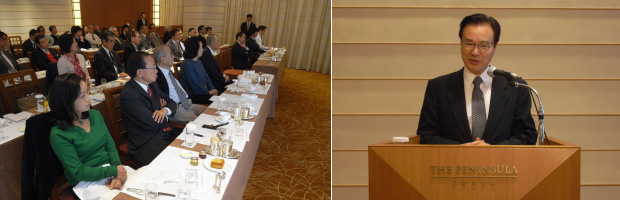 10月29日(水)、ザ・ペニンシュラ東京で朝食勉強会を開催させていただきました。 今回は元外務事務次官の谷内正太郎様を講師にお招きし「最近の日本外交の課題~アジアを中心に~」というテーマでお話いただきました。 谷内様は麻生首相が外務大臣時代に事務次官をお勤めになられています。まず始めに麻生首相の外交に対する基本姿勢をお話いただき、その後、小泉、安倍、福田政権時の外交の特色、主要国との関係をいろいろなエピソードを交えながらお話いただきました。