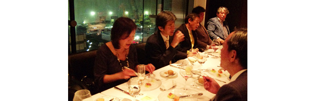 今回は19名御参加頂き、中島事務局長の乾杯と共にコーススタートです。新玉ネギの甘みを活かした、食事としてのクレームブリュレ、山うどのガスパチョ、サーモンの白ゴマまぶし燻製ワサビクリームのソースなど“和”の食材やエッセンスを散りばめた新しいフランス料理。そして、手長エビや春が旬のシャロレー種と言う仔牛など王道的な料理へと続きます。デザートも2皿と大変充実したコースを満喫しました。味はしっかりとしていますが、食べ飽きることのない美味しい料理でした。最後に理事の山口登氏に締めの言葉を頂き閉会となりました。 フレンチと言うとちょっと気取った感じですが、グルメ会と言うことで仲間同士、和やかな雰囲気が溢れ、とても楽しい会となりました。次回も御参加お待ちしております。