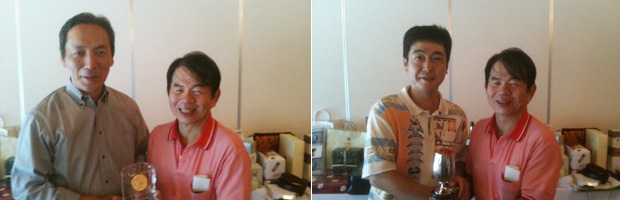 この難しいコンディションの中、優勝は斎藤崇人氏(60年卒)、43、39の82で昨年秋の茂原CCの会に続き、連続ベスグロ優勝です。和田会長より優勝カップが授与されました。この日の80台はもう一人、和田会長(43、46の89)の2人だけでした。そして、準優勝は梅田憲司氏(50年卒)48、43の91で、和田会長よりクリスタル製の盾が授与されました。