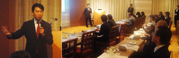 2011年第1回朝食勉強会を 10月27日(木)ザ・ペニンシュラ東京「ザ・ギンザボールルーム」にて 開催しました。 講師に池田雄之輔氏(野村證券株式会社金融市場調査部 国際金融為替調査課長 チーフ為替ストラテジスト)をお招きし、「景気後退リスクと主要通貨シナリオ」というテーマでご講演いただきました。