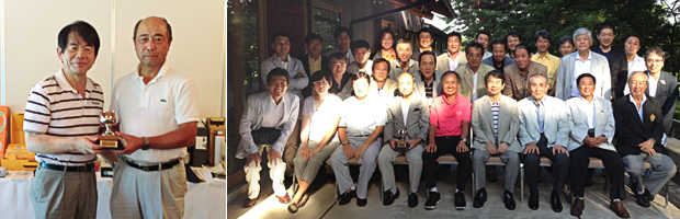 和田会長にご挨拶頂き、パーティーが始まりました。今回の優勝は 吉原 克夫氏(S42年卒)です。40、40 の80と言う立派なスコアで、和田会長より優勝カップが渡されました。次回からはシングルかも!?準優勝は 金原宏和氏(S60年卒)です。40、46の86でした。和田会長よりクリスタル製の楯が渡されました。